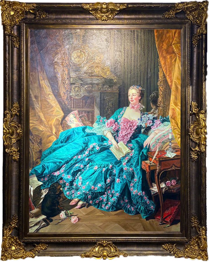 Bức tranh mang phong cách Rococo – Baroque, nổi bật với bộ váy xanh ngọc được vẽ tỉ mỉ từng nếp gấp, hoa văn, ánh sáng và độ chuyển sắc hoàn hảo. Khung tranh họa tiết chạm nổi mạ vàng càng làm tăng giá trị thẩm mỹ và sự đẳng cấp cho tổng thể tác phẩm.