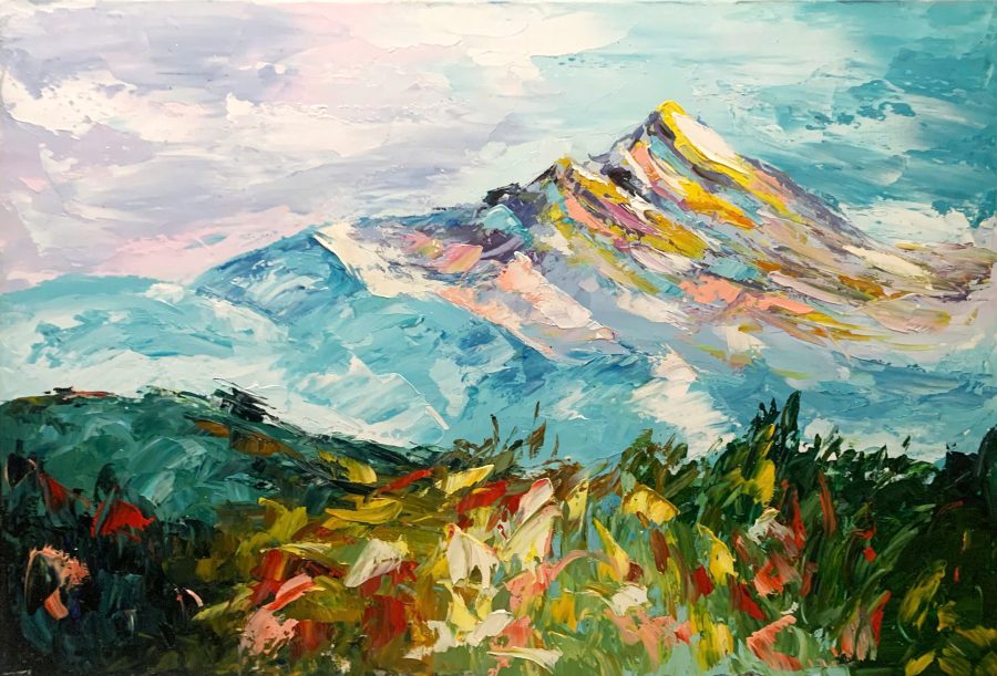Tranh được vẽ hoàn toàn bằng sơn dầu cao cấp trên canvas chuyên dụng, sử dụng kỹ thuật chồng lớp màu điêu luyện, giúp bề mặt tranh có độ sâu, độ bắt sáng và độ bền màu vượt trội theo thời gian. Từng nhát cọ được chăm chút tỉ mỉ, từ những đỉnh núi xa mờ đến phần tiền cảnh mềm mại, tạo nên tổng thể hài hòa và sinh động.