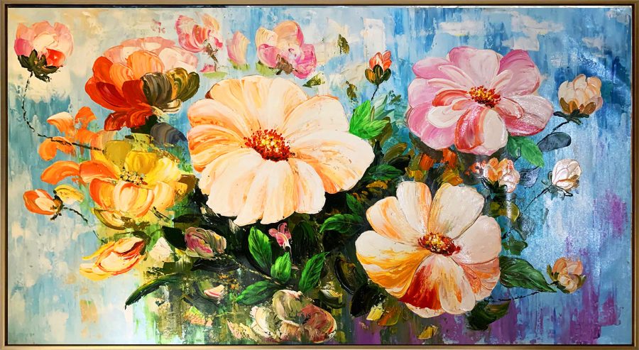 Bức tranh THH12 tái hiện hình ảnh những đóa hoa nở bung rực rỡ trên nền màu xanh – tím – trắng nhẹ nhàng, tạo nên sự tương phản hài hòa giữa sự mềm mại và nổi bật. Các bông hoa lớn nhỏ đan xen, lớp cánh hoa được xử lý bằng những nét cọ dày, tạo chiều sâu và độ nổi sống động đặc trưng của tranh sơn dầu cao cấp.