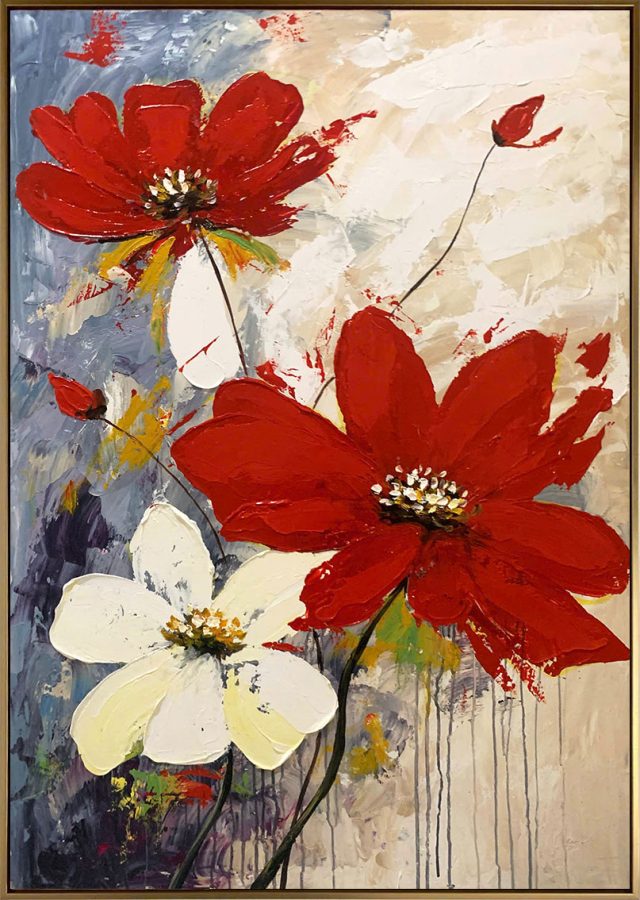 Tác phẩm thể hiện hình ảnh những đóa hoa lớn bung nở, nổi bật trên nền màu trung tính được xử lý bằng kỹ thuật sơn dầu đắp nổi tinh tế. Nét vẽ mạnh mẽ nhưng mềm mại, kết hợp màu sắc tương phản đỏ – trắng – xanh nhạt tạo nên tổng thể vừa phóng khoáng, vừa đầy nghệ thuật. Đây chính là một lựa chọn hoàn hảo cho những ai yêu thích sự độc đáo, sang trọng và cá tính.