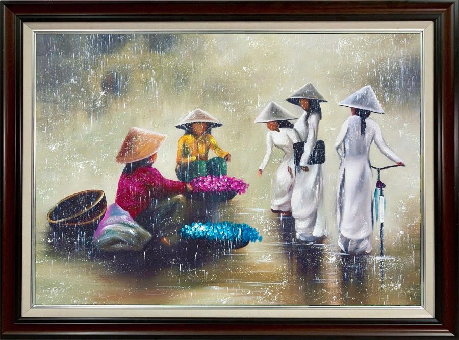 Tranh sơn dầu THH51 tái hiện một phiên chợ quê trong cơn mưa nhẹ – nơi những người phụ nữ đội nón lá, áo dài trắng và những người bán hàng giản dị gặp gỡ nhau giữa đời sống thường nhật. Bức tranh ghi lại khoảnh khắc rất đỗi thân thương của văn hóa Việt: bình yên, mộc mạc nhưng chan chứa tình người.