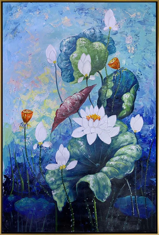 Bố cục tranh được xây dựng trên nền nước xanh sâu, nơi những lá sen lớn xoè ra ôm trọn những bông sen trắng đang khoe sắc. Từng chi tiết – từ cánh sen, đài sen, lá già, lá non – đều được thể hiện bằng chất liệu sơn dầu cao cấp, cho độ nổi khối mạnh, tạo cảm giác chân thật và sang trọng.