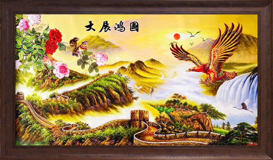 Bức tranh gây ấn tượng mạnh bởi hình ảnh núi non trùng điệp, Trường Thành uốn lượn, đại bàng tung cánh và ánh mặt trời – tất cả hòa quyện tạo nên một tổng thể hùng vĩ, quyền lực và đầy khí chất. Tông màu vàng kim – xanh núi – đỏ mặt trời được xử lý hài hòa, giúp bức tranh vừa rực rỡ, vừa giữ được sự sang trọng và chiều sâu.